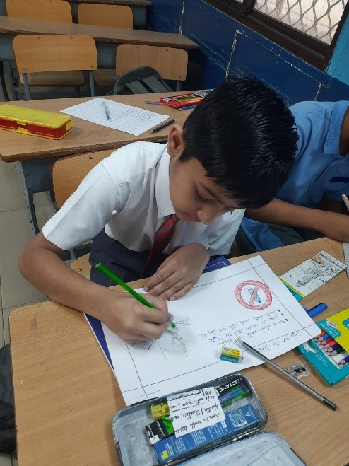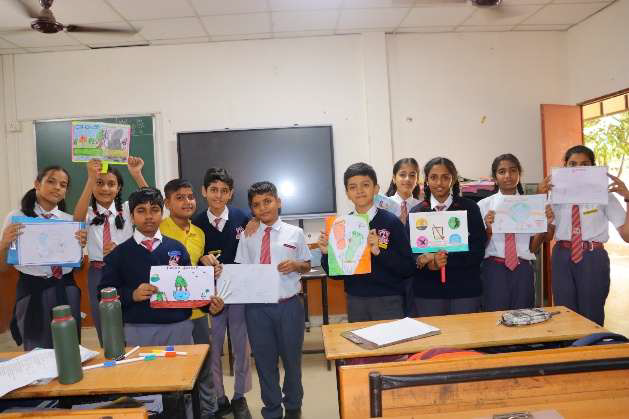 As part of the Swachhata celebrations, the students of Classes 6th and 7th, enthusiastically participated in Swachhotsav, a colourful and vibrant display of creativity and awareness. The event included Slogan Writing, Poster Making, and Placard Designing activities, each created to highlight the significance of hygiene, waste segregation, and the maintenance of clean surroundings. The young artists, armed with brushes, markers, and vivid imaginations, transformed sheets of paper into powerful canvases of change. Their posters sparkled with vibrant hues depicting clean rivers, green parks, dustbins labelled for segregation, and the vision of a pollution free India.