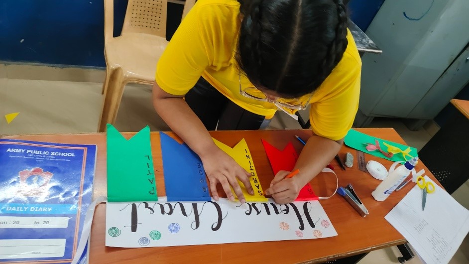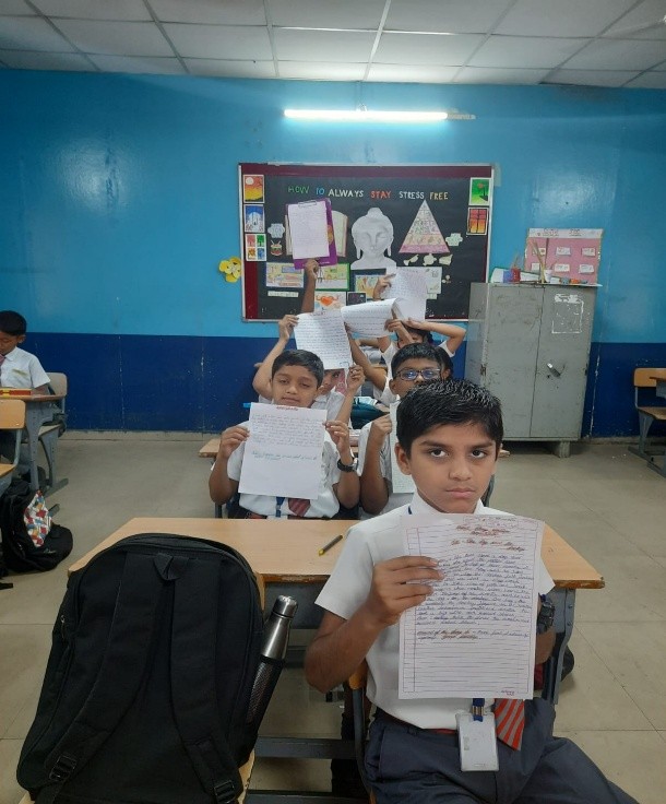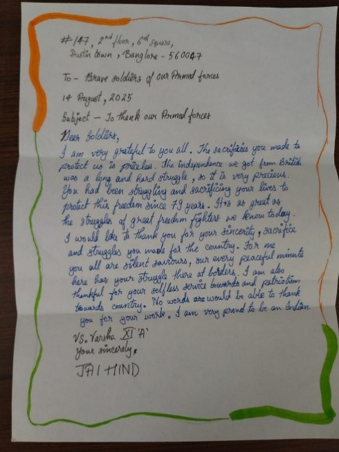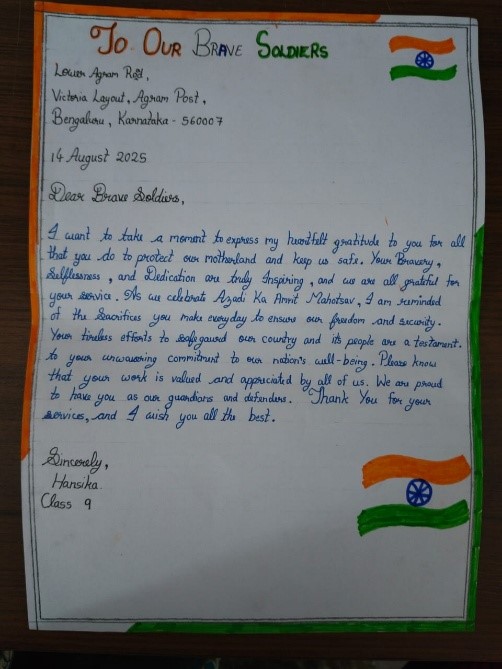 As part of the Azadi Ka Amrit Mahotsav, our school organized a heart warming activity titled Letters to Soldiers for students of Classes VI to XII. The objective of the activity was to express gratitude, respect, and affection towards the brave soldiers of the Indian Armed Forces who guard our nations borders under challenging conditions. Students wrote handwritten letters and creative messages expressing their heartfelt appreciation for the soldiers courage, discipline, and sacrifice. Many letters included poems, drawings of the national flag, and patriotic slogans. Selected letters were compiled and displayed on the school bulletin board, while some were sent to the nearest Army Postal service through the school administration. The soldiers messages of thanks deeply inspired the students. The activity helped inculcate patriotism, empathy, and emotional connection with the defenders of the nation, reminding everyone that our freedom is protected through their selfless service.