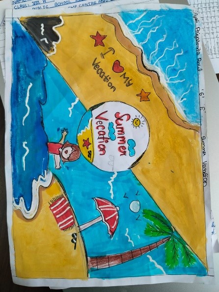 To encourage creative expression and celebrate the imaginative spirit of young learners, a painting competition was organized for the students of Class VI on the theme My Colourful Summer Vacation. A Season of Stories, Sunshine and Self Discovery. The competition provided students with an opportunity to reflect on their summer experiences and express their feelings through art. The best entries were selected based on creativity, originality, use of colour, and thematic relevance. These selected artworks have been sent as entries for the July edition of Sapno ki Udaan an e Magazine published by NCERT, which aims to showcase student talent at the national level.