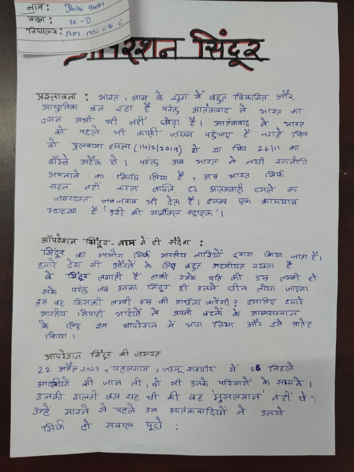 As part of the MyGov initiative, an essay writing competition was organized on 28th June on the topic (Operation Sindoor Redefining Indias Policy Against Terrorism). The competition aimed to make students aware of Indias evolving and assertive stance against terrorism. Participants from classes 9th to 12th penned powerful essays, expressing their understanding of Indias strategic shift in dealing with terror threats. The essays reflected themes such as national security, counter terrorism operations, cross border defence, cyber warfare, and the pivotal role of intelligence agencies and armed forces. The best entries have been submitted on the MyGov platform, encouraging student engagement in national discussions.