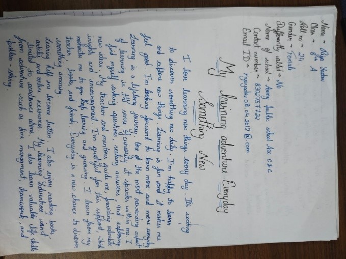 An essay writing competition was conducted for Class VIII students on the theme My Colorful Summer Vacation. A Season of Stories, Sunshine and Self Discovery. The objective of the competition was to encourage students to reflect on their personal summer experiences and develop their creative writing skills. The entries were evaluated on the basis of originality, coherence, grammar, and relevance to the theme. The best essays from the competition have been selected and sent as entries for the July edition of Sapno ki Udaan an e Magazine published by NCERT, which aims to highlight student creativity at the national level.