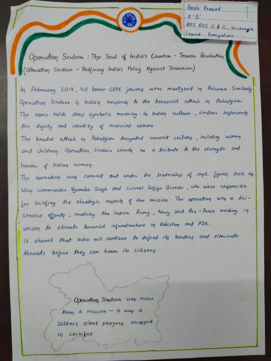 As part of the MyGov initiative, an essay writing competition was organized on 28th June on the topic (Operation Sindoor Redefining Indias Policy Against Terrorism). The competition aimed to make students aware of Indias evolving and assertive stance against terrorism. Participants from classes 9th to 12th penned powerful essays, expressing their understanding of Indias strategic shift in dealing with terror threats. The essays reflected themes such as national security, counter terrorism operations, cross border defence, cyber warfare, and the pivotal role of intelligence agencies and armed forces. The best entries have been submitted on the MyGov platform, encouraging student engagement in national discussions.
