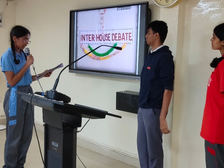 The much-awaited Interhouse English Debate Competition for students of Classes 9 and 11 was held with great enthusiasm and participation. Topic given for the debate was, Privacy is a Myth in the Digital World. Participants passionately argued for and against the motion, bringing in diverse perspectives backed by current examples, statistics, and real-life implications of surveillance, data breaches, and digital footprints. Each participant was given 4 minutes to present their views, followed by interjections that challenged their stance, further enriching the quality of debate and encouraging critical thinking. The event successfully fostered public speaking skills, analytical thinking, and respectful discourse among students.