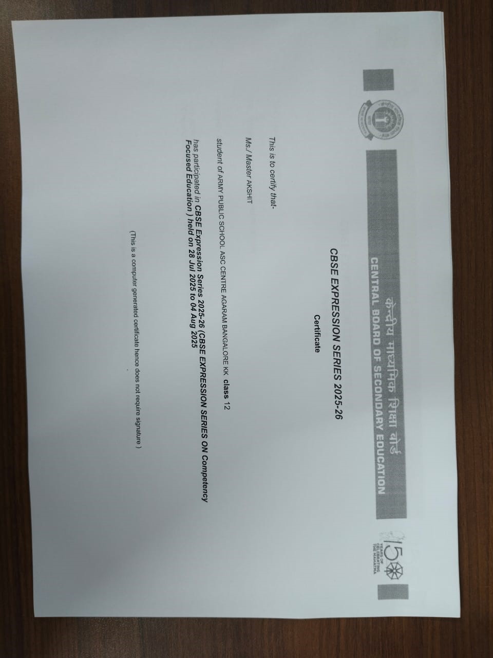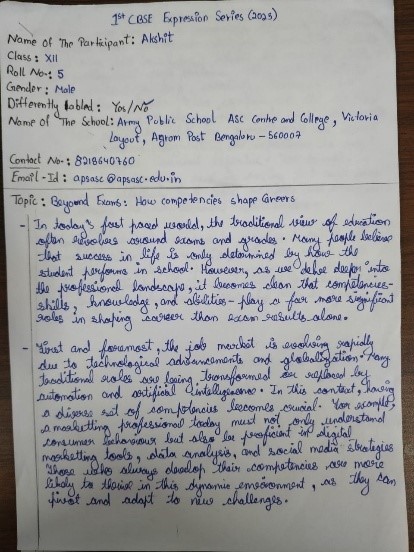 Army Public School ASC Centre and College enthusiastically conducted the 1st CBSE Expression Series for the academic session 2025 26 on 2nd August 2025. The event was held in accordance with the guidelines issued by the CBSE on the theme Competency Focused Education. Secondary Stage Phase 2 Classes 11 to 12 Essay on the topic Beyond Exams How competencies shape careers. The best entries from each category one per class group were shortlisted after internal evaluation by a panel of teachers and uploaded via the CBSE Expression Series Android App as per the boards instructions. These entries are now under consideration for recognition at the Regional and National levels, with the best submissions to be featured on the official CBSE website. The event proved to be a meaningful platform for nurturing student voice and creativity aligned with the goals of the National Education Policy.