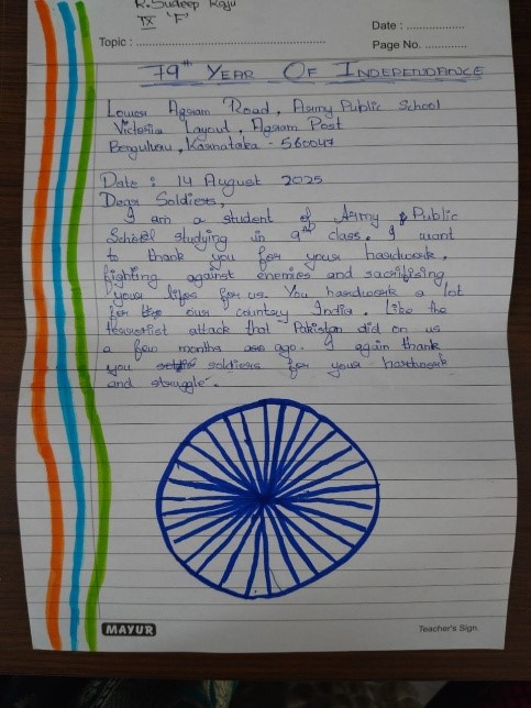 As part of the Azadi Ka Amrit Mahotsav, our school organized a heart warming activity titled Letters to Soldiers for students of Classes VI to XII. The objective of the activity was to express gratitude, respect, and affection towards the brave soldiers of the Indian Armed Forces who guard our nations borders under challenging conditions. Students wrote handwritten letters and creative messages expressing their heartfelt appreciation for the soldiers courage, discipline, and sacrifice. Many letters included poems, drawings of the national flag, and patriotic slogans. Selected letters were compiled and displayed on the school bulletin board, while some were sent to the nearest Army Postal service through the school administration. The soldiers messages of thanks deeply inspired the students. The activity helped inculcate patriotism, empathy, and emotional connection with the defenders of the nation, reminding everyone that our freedom is protected through their selfless service.